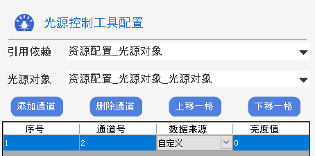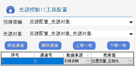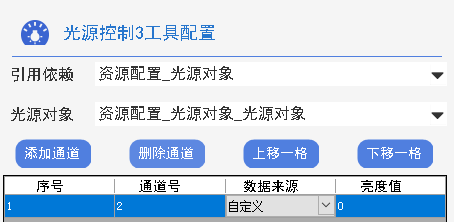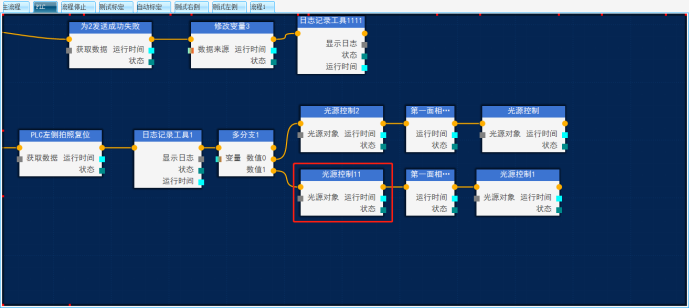 当拍照次数变量值为1时表明设备将在左侧进行拍照,使用光源控制算子配置通道2光源亮度来自左侧光源亮度变量,左侧光源亮度变量值由HMI界面传递