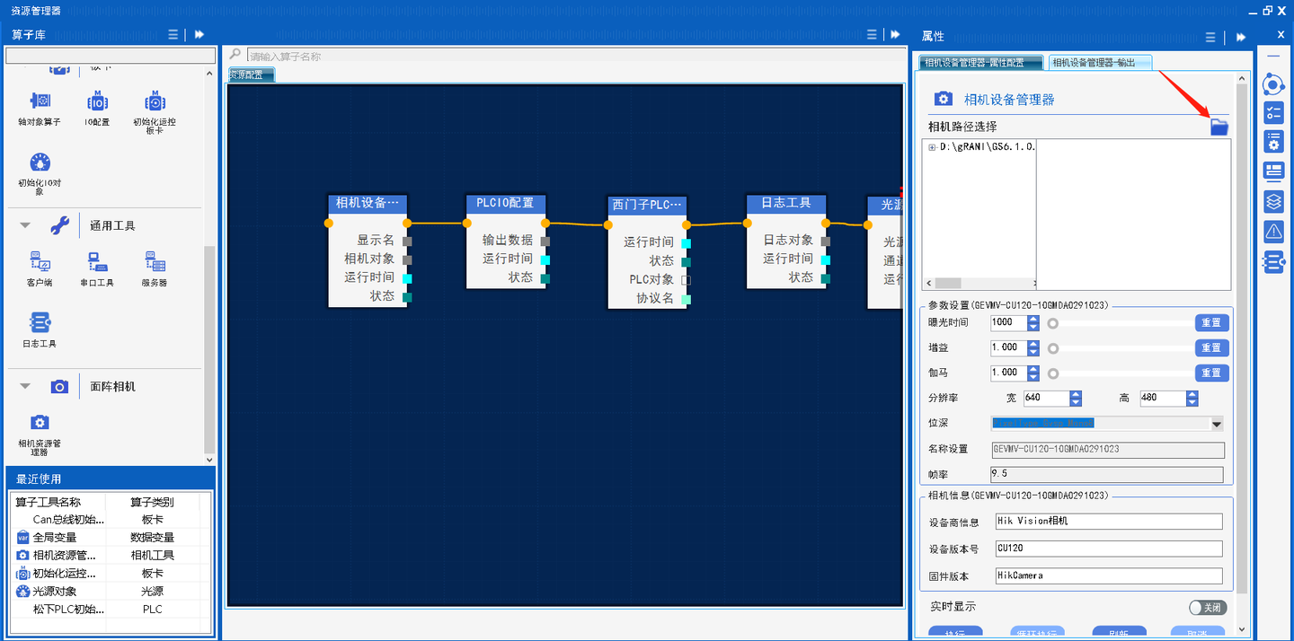 步骤1.图像采集:通过面阵相机算子实现采图,算子引用资源管理器内相机资源管理器算子输出的相机对象,相机列表选择设备相机名称,采集一张图进行定位即可,设置采集模式为单帧采集,配置曝光时间、伽马等参数