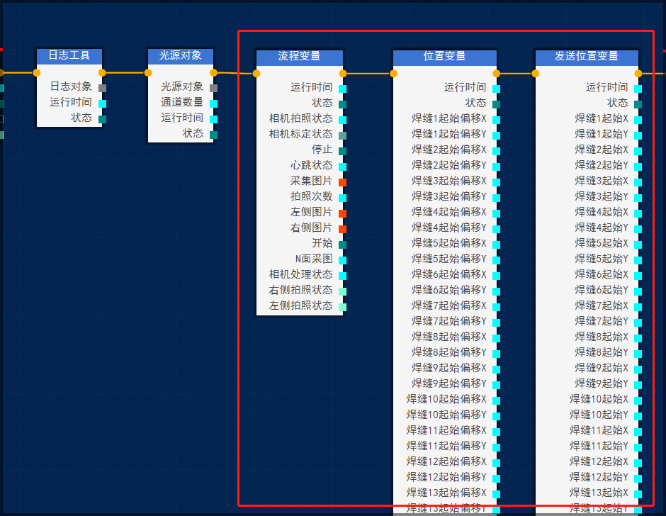 第五步:配置使用变量,包括控制流程运行变量(开始、停止、左侧拍照状态、右侧拍照状态)、位置变量(存储HMI开放参数)、发送位置变量(发送引导到焊接位置结果)等