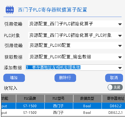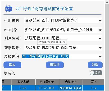 步骤3. 发送视觉软件准备OK:使用西门子PLC寄存器赋值算子给PLC提供准备OK地址赋值,算子引用资源管理器内的西门子PLC初始化与PLCIO配置算子输出资源,通过地址信息下拉列表找到准备OK地址,加到表格内,发送true,PLC接收到设备继续运行。