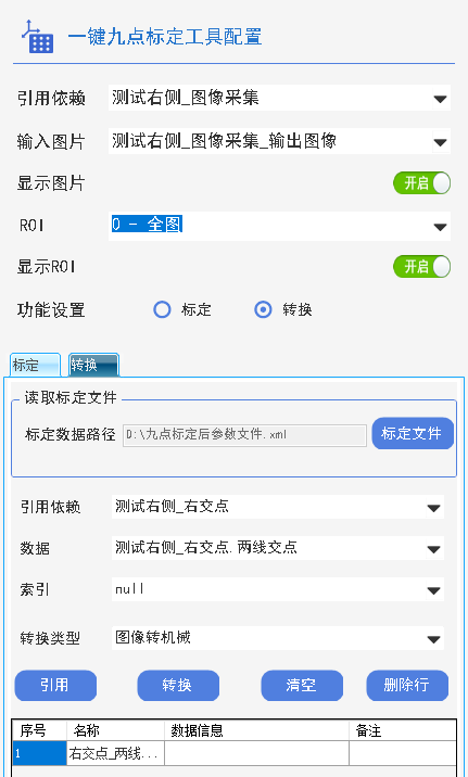 步骤8.像素坐标转换为实际坐标:通过一键九点标定算子实现坐标转换功能,算子具备标定和像素坐标转机械坐标功能,算子导入标定文件以及引用两线交点坐标,选择图像转机械,即可输出产品角点在相机视野中的物理坐标