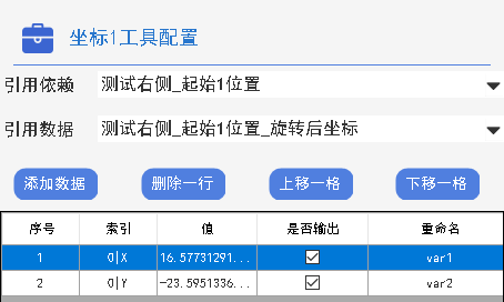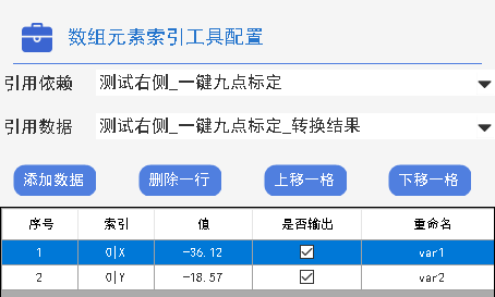 通过数组元素索引算子提取出坐标转换后的XY值,引用一键九点标定算子转换结果,添加到配置表格将是否输出列打“√”,完成XY值提取