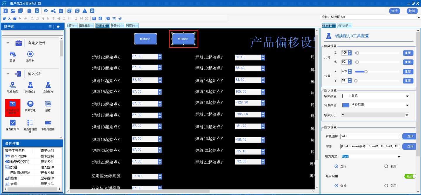 切换配方:通过切换配方控件导入存储的参数文件,导入后的界面控件显示参数跟随文件参数自动刷新