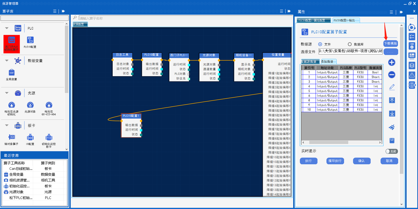 通过PLCIO配置算子导入配置过的PLC文件为主任务设计器制作寄存器写入和读取做准备。