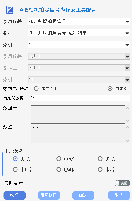 使用文本对比算子引用转换结果与文本True做对比(与PLC规定此寄存器地址为True时表明需要拍照定位)