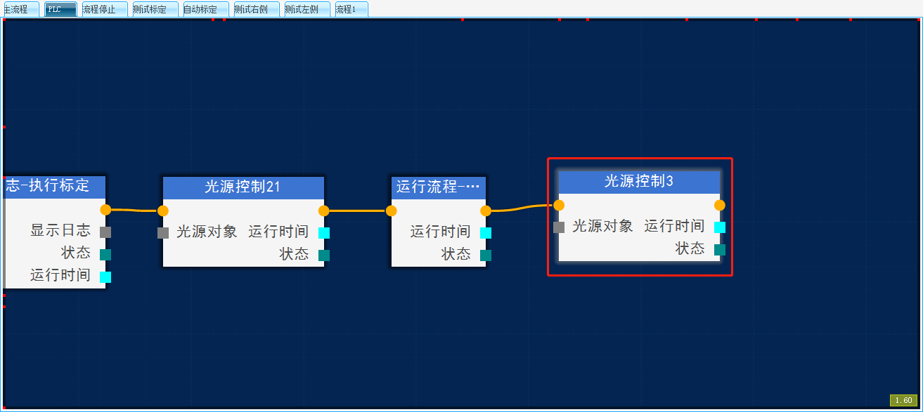 标定前需要先控制光源亮度,使用光源控制算子,算子引用资源管理器光源对象资源实现光源控制,设备光源使用通道号为2,控制通道2亮度为160