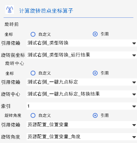 使用计算旋转后点坐标算子计算实际焊接点位置,将理论设计位置(虚拟坐标)转换为实际物理空间中的焊接位置,补偿软包电池摆放造成的位置偏差,算子以转换坐标为旋转中心,虚拟坐标为旋转前坐标,旋转角度引用角度变量,得到起始焊接点位置,左侧计算10组焊接点,后续9组焊接点使用流程相同