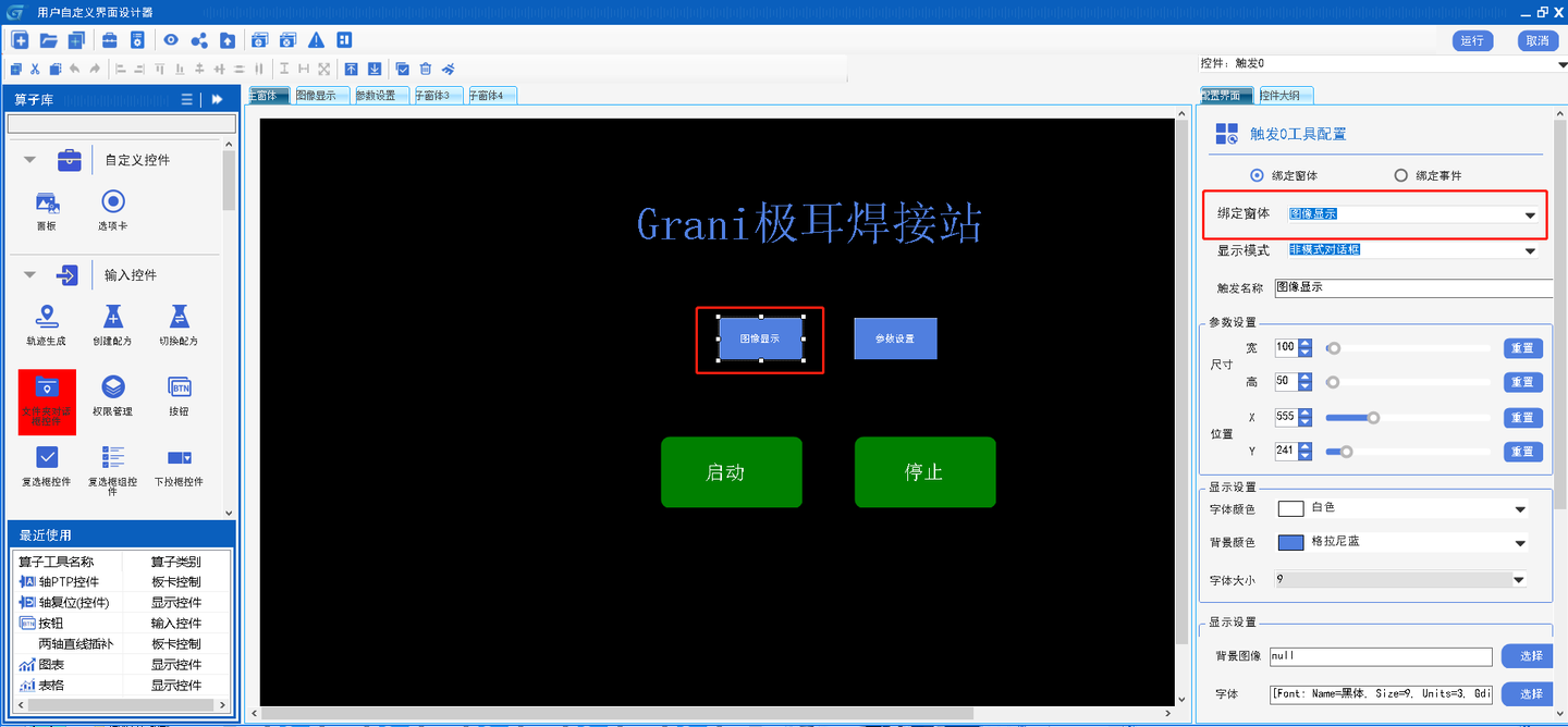 打开图像显示、参数设置界面:使用触发控件,配置绑定窗口,运行HMI鼠标单击此按钮打开对应界面