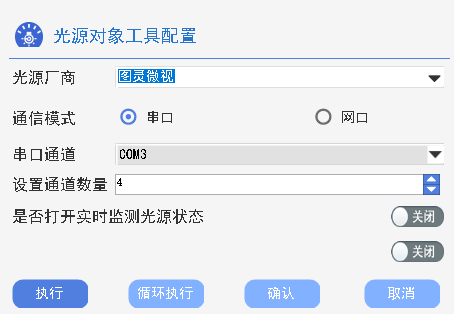 第四步:连接图灵威视光源控制器,使用光源对象算子厂商选择图灵威视,通过RS232通讯线连接,通讯模式选择串口,配置连接端口号,控制器有4个光源通道,因此通道数量设置4,完成光源连接