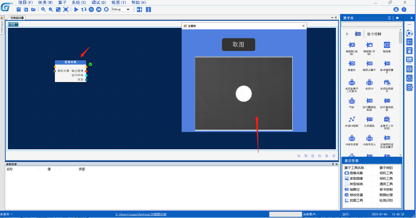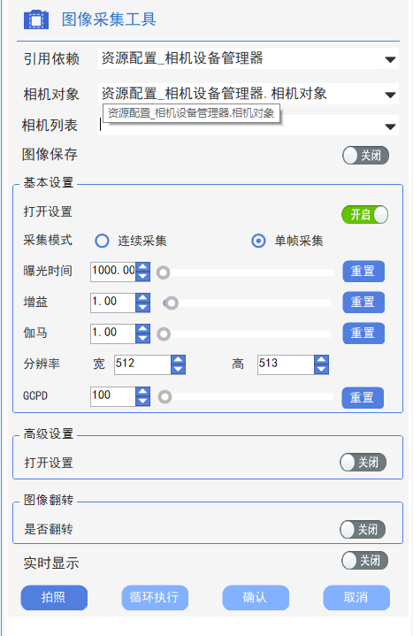 在主流程我们通过主任务设计器相机工具内的图像采集算子配置参数实现采图,配置如下: