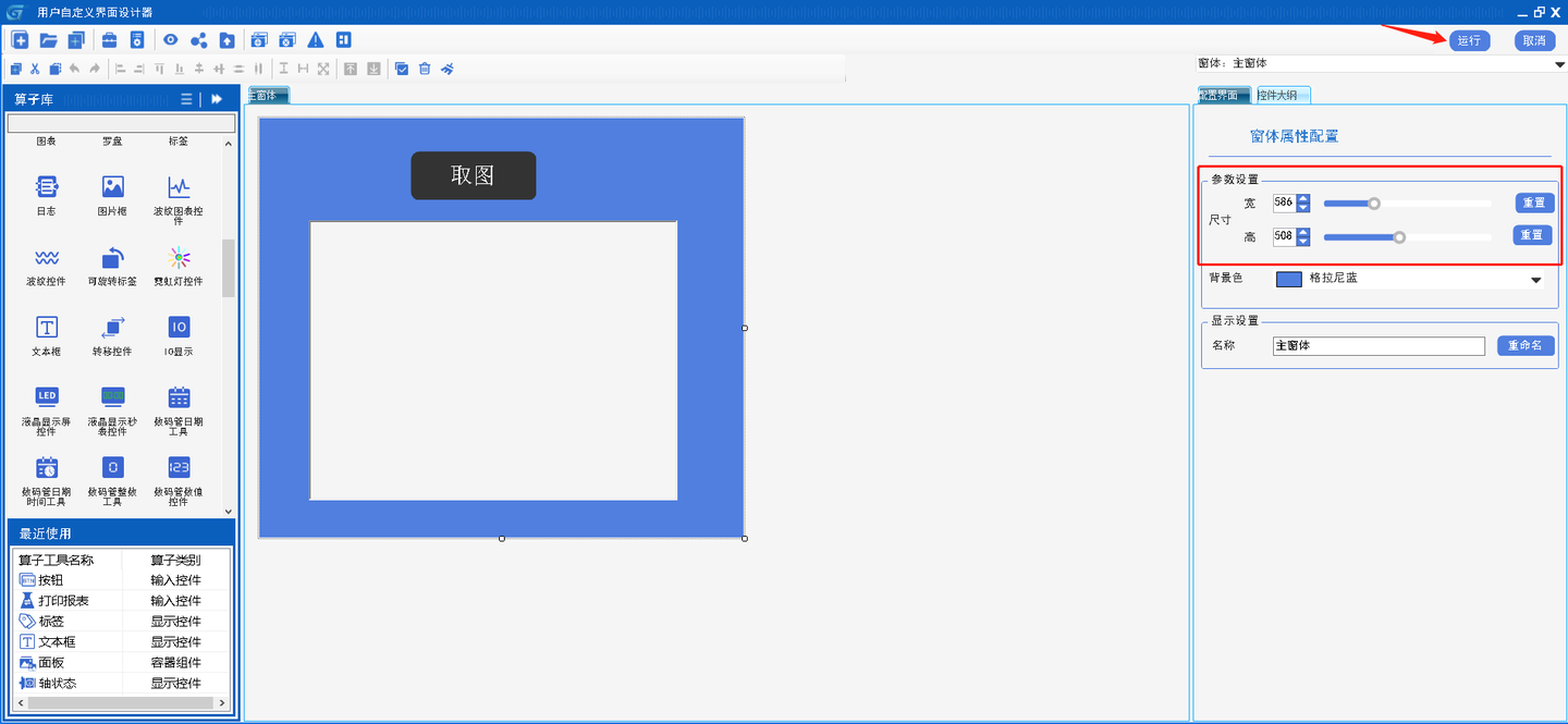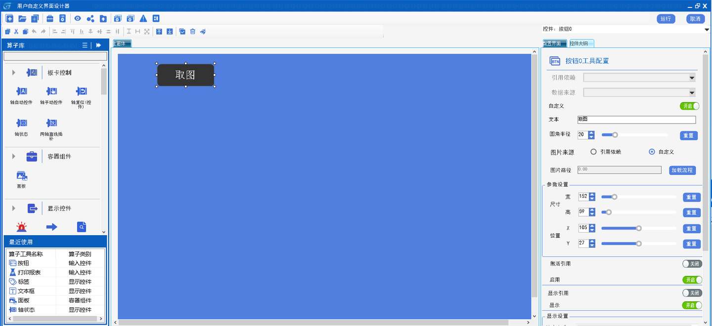 通过HMI设计一个和主任务设计器流程交互的界面,在HMI界面算子库输入控件内找到按钮控件,使用一个按钮控件,更改显示名称为取图,使用控件配置界面调整样式。