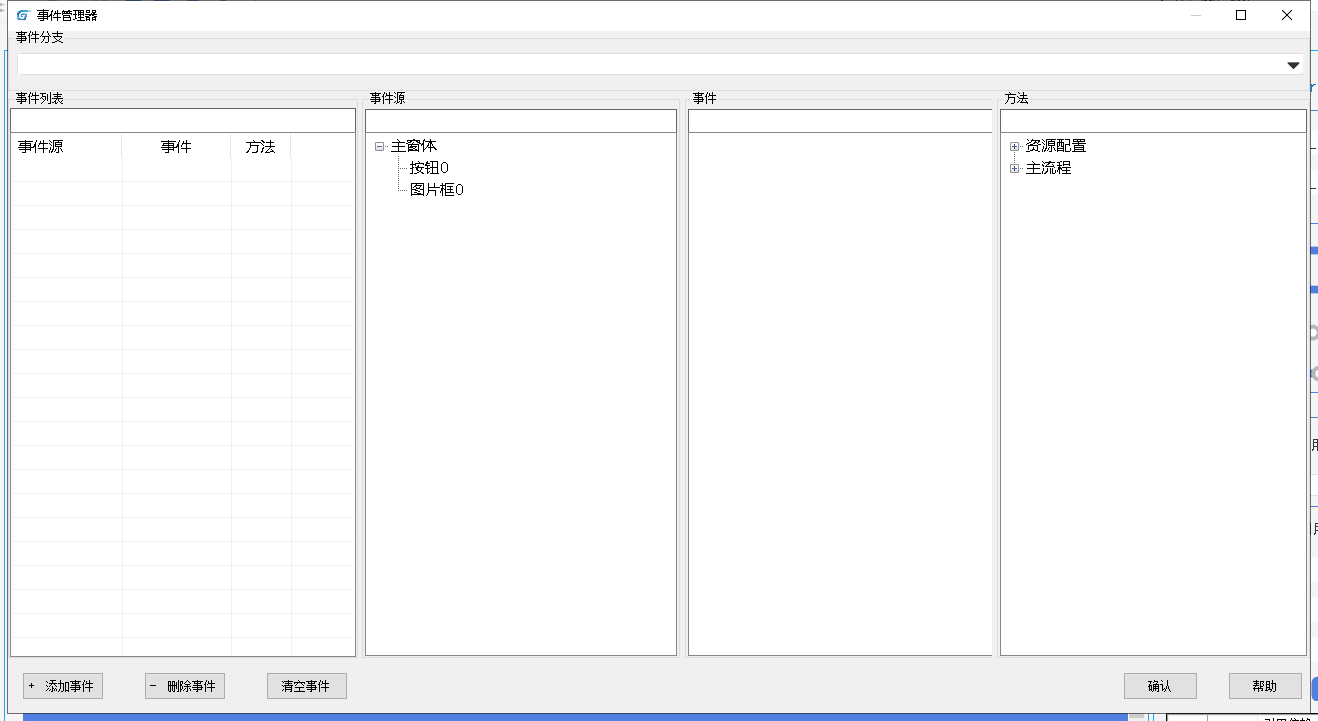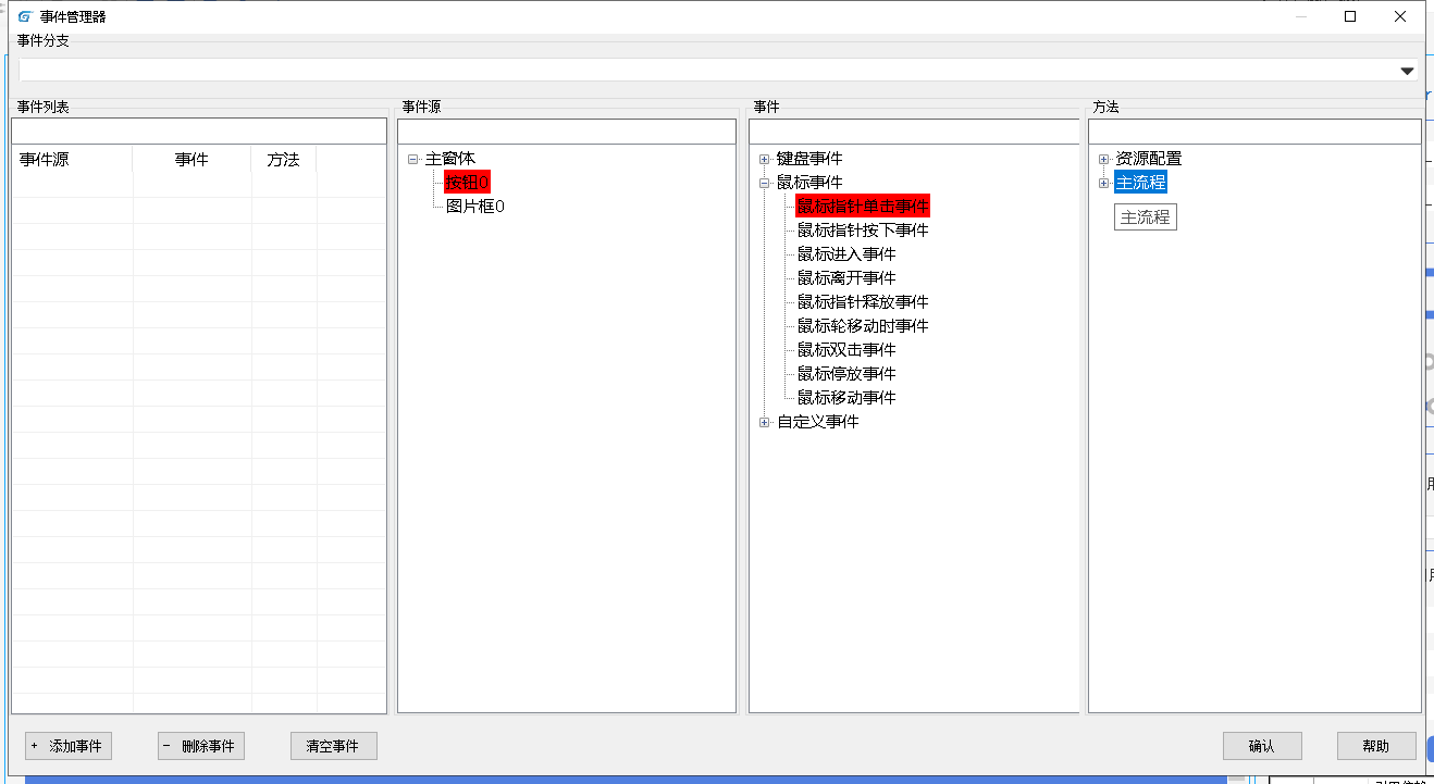 点击后显示事件管理器窗口,在事件源类显示着HMI上的控件,点击主窗体可进行查看。