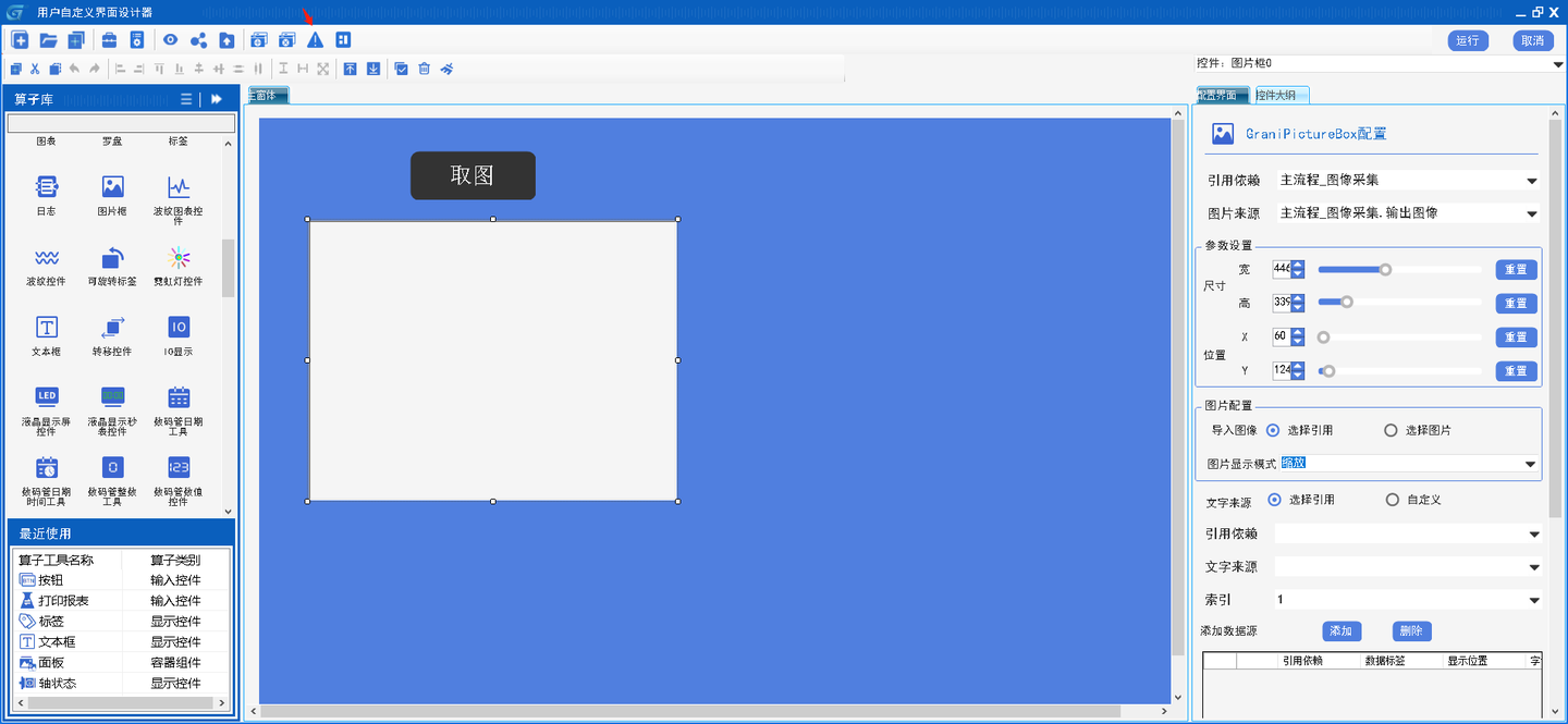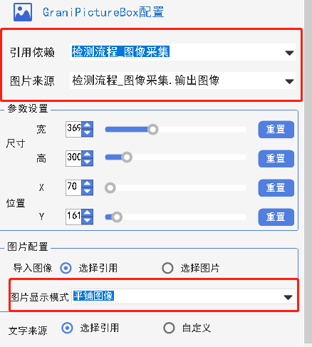 使用算子库显示控件模块内的图片框在HMI做一个显示相机采集图像的功能,将图片框控件拖到HMI上,进行如下配置: