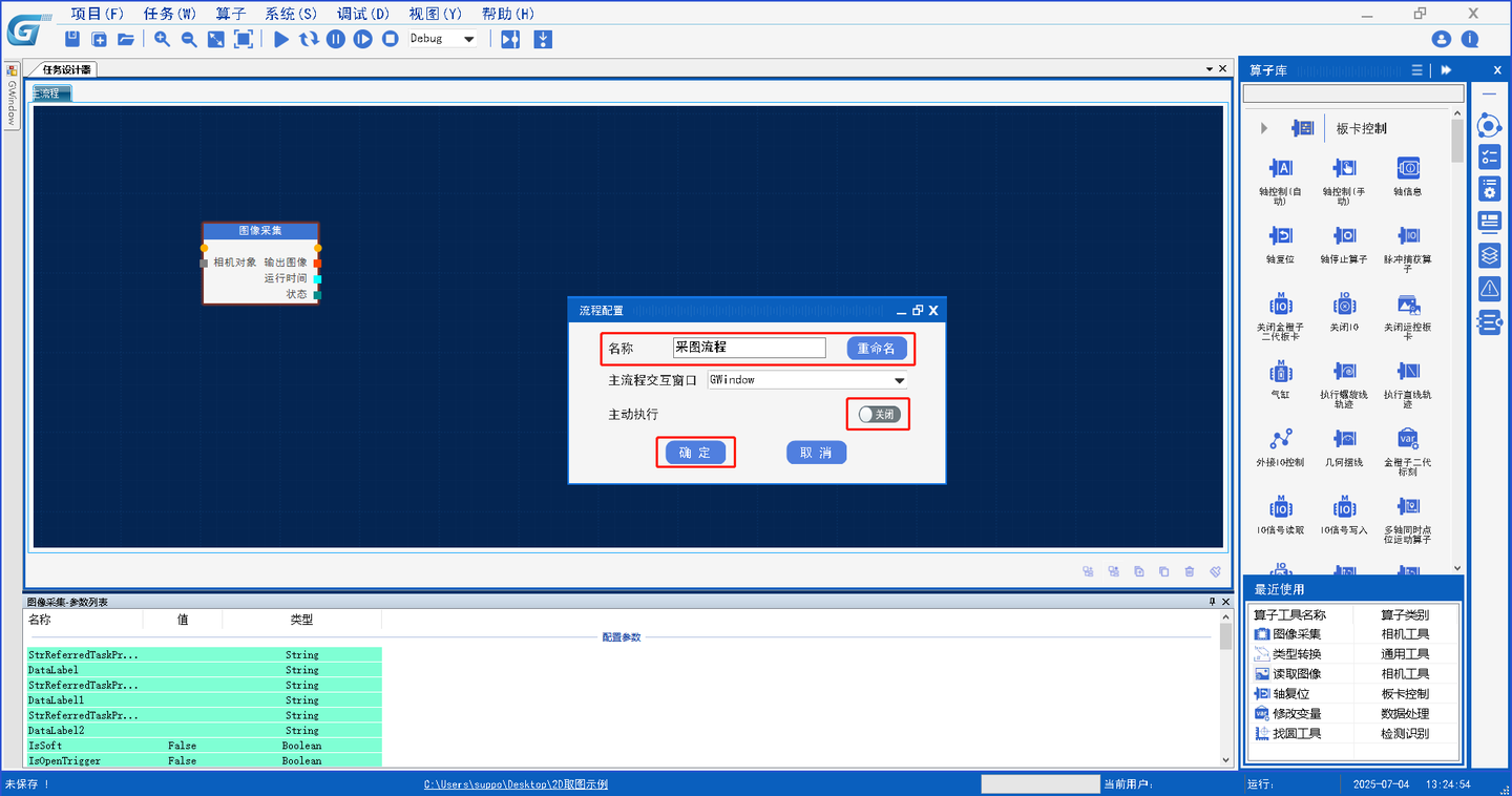 将此流程名称修改为采图流程,并关闭主动执行,点击确定,完成配置,主任务设计器内的算子输出结果HMI设计器可以使用。