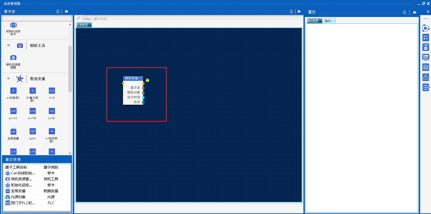 首先实现取图之前要先连接相机,连接相机是硬件资源,通过平台资源管理器算子库相机工具模块当中拖出相机资源管理器算子。