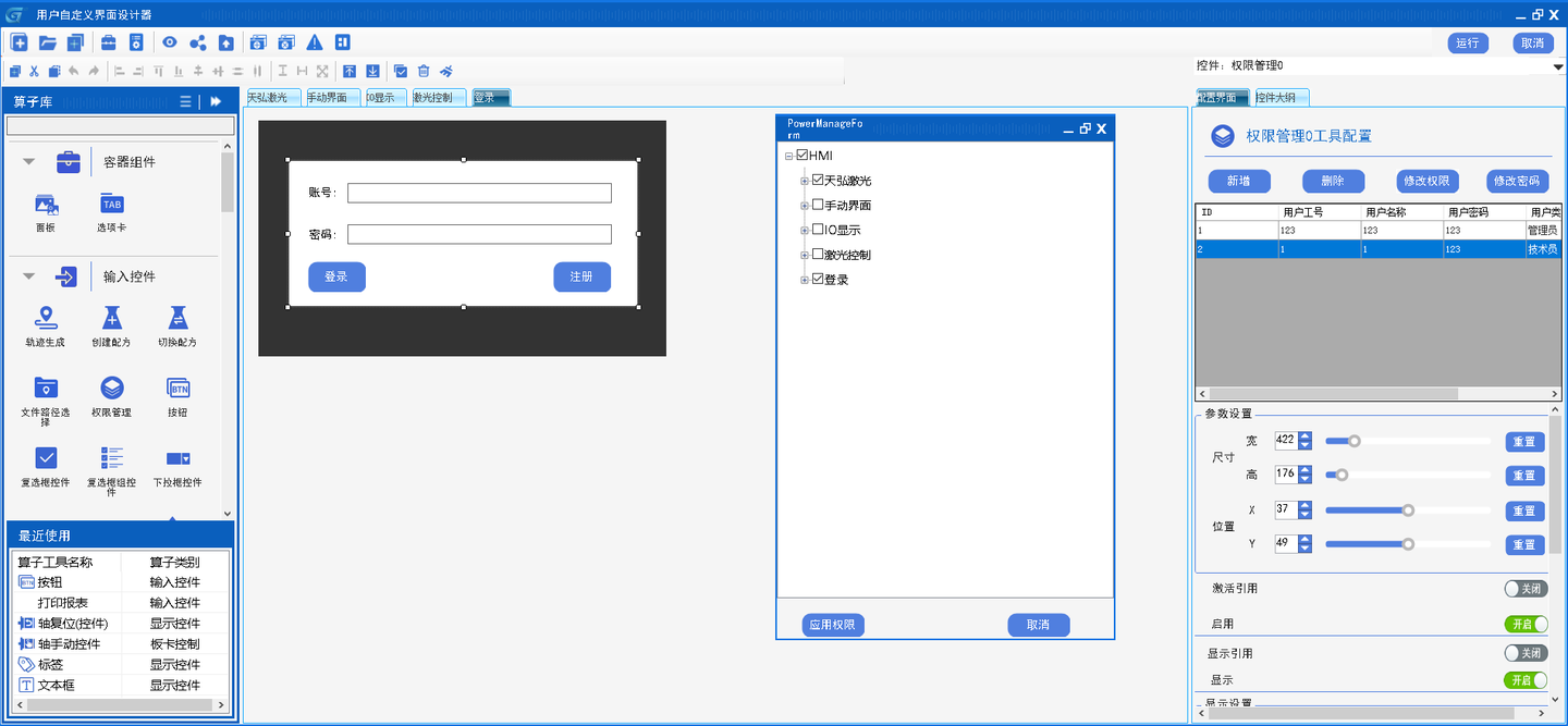 1.权限管理:登录界面是一个单独的窗口,界面不需要制作太大,通过权限管理控件实现使用限制,配置操作员登录时可使用的界面,管理员无需做限制。