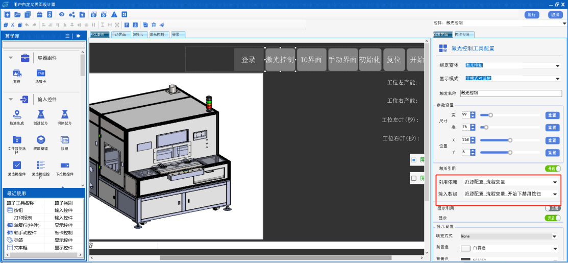 在软件使用时,为避免在设备焊接时出现使用人员误碰导致操作了IO出现异常的情况,因此给IO显示控制激光引用资源管理器流程变量中的开始下禁用按钮变量,在设备处于开始时主任务设计器算子会将此变量设置为false,控制IO显示控件无法使用。