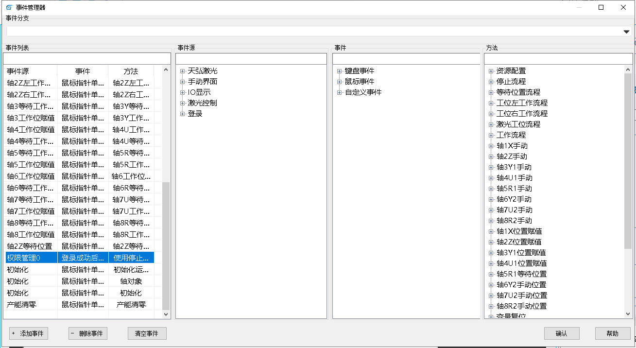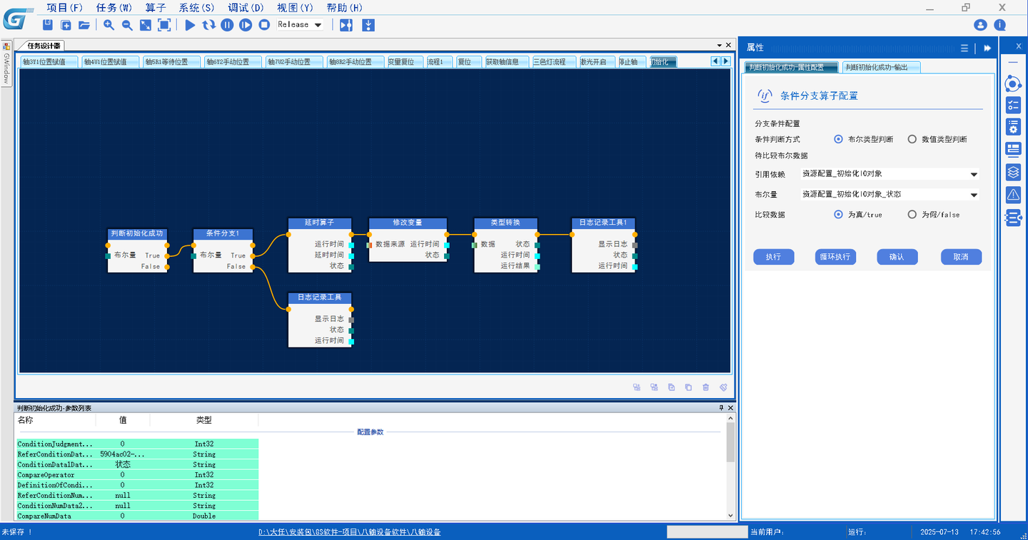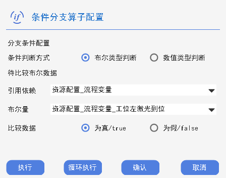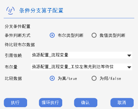 等待激光反馈到位:等待X轴到右工位出光位置是根据资源管理器中流程变量内的工位右激光到位变量实现,等待激光X和Z轴到工作位,到位激光工位流程对此变量赋值true,通过条件分支工具对此变量进行判断实现等待。