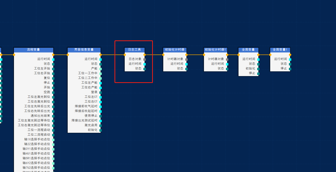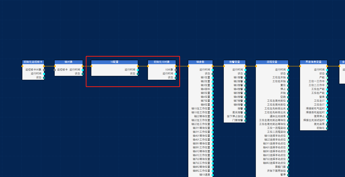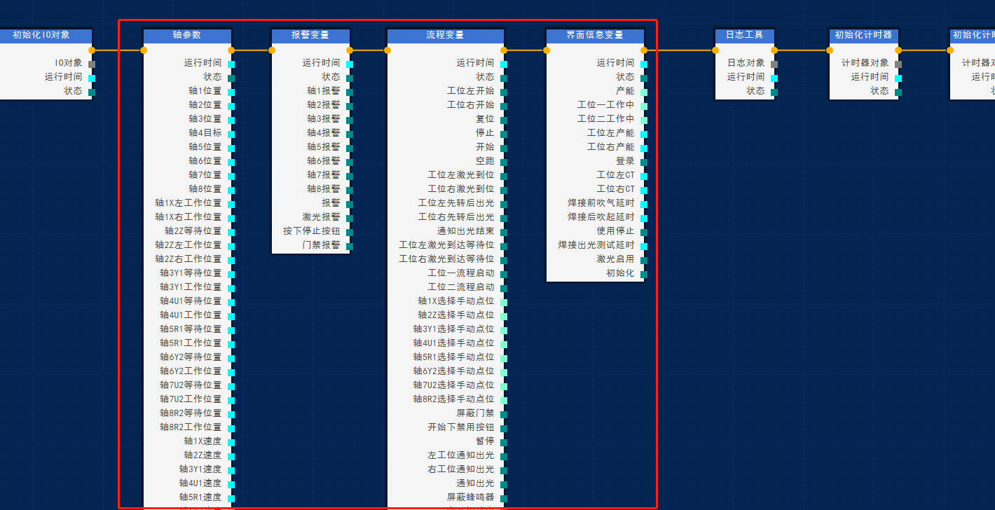 第五步:8轴焊接设备包含双工位,要求有两个工位的CT记录,使用两个初始化计时器算子后续配合主任务设计器计时器开启以及计时器停止算子实现CT记录