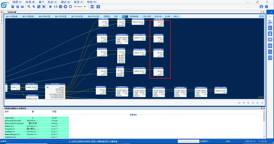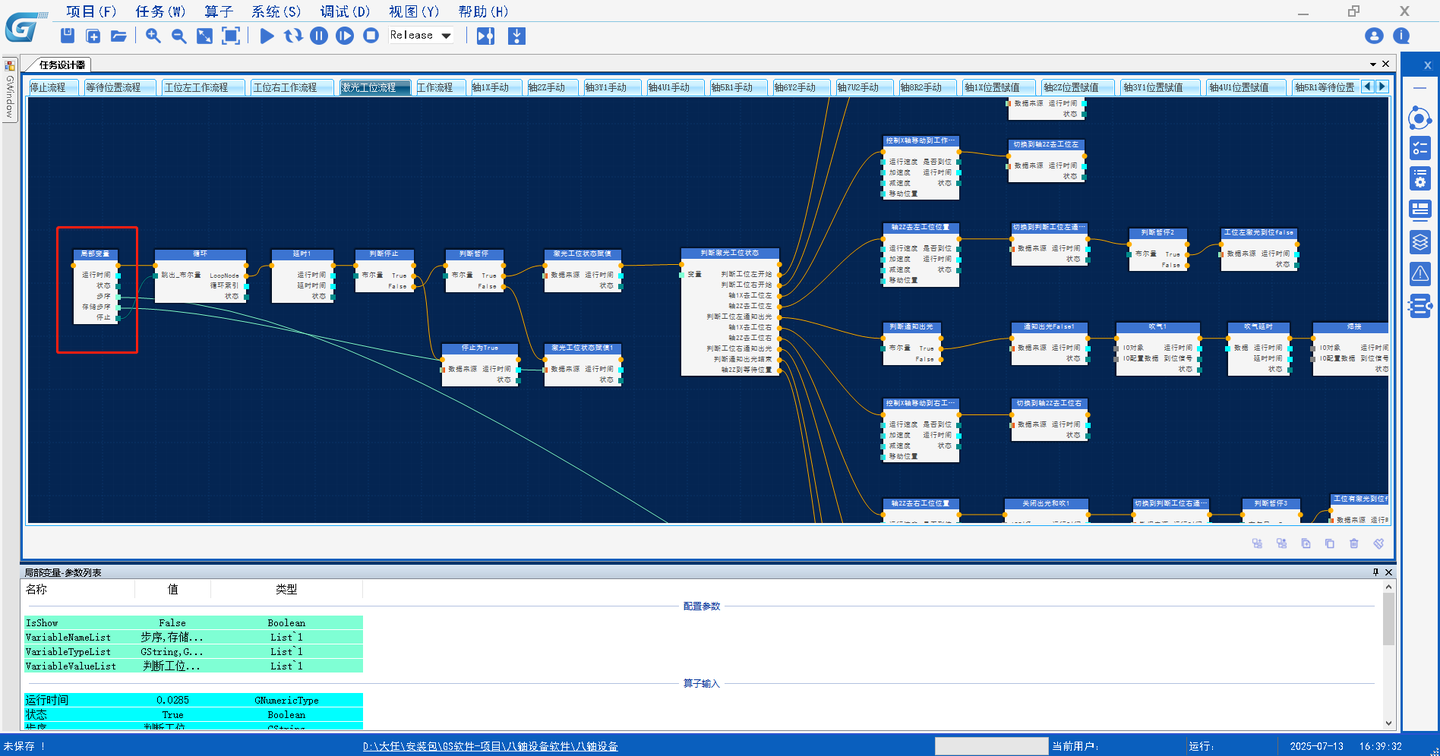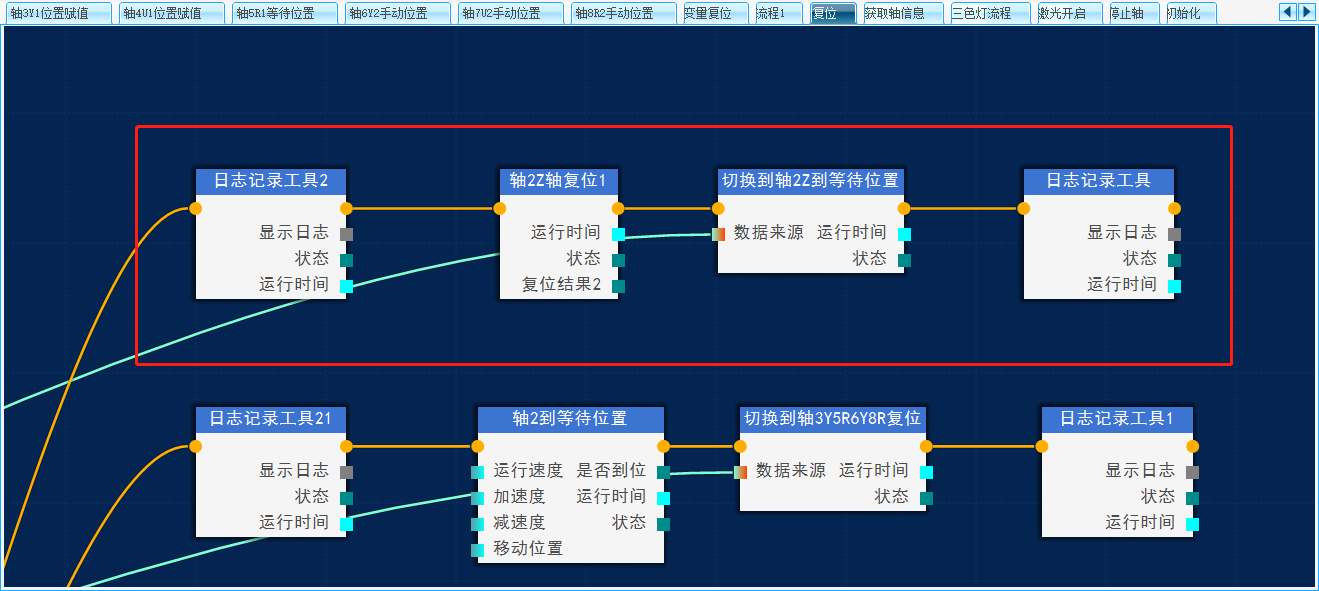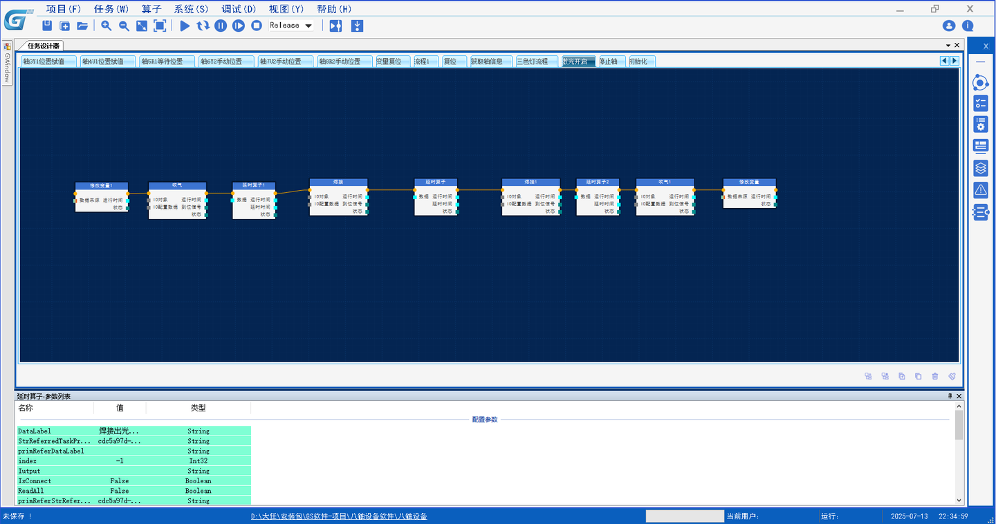 第五步:8轴焊接设备包含双工位,要求有两个工位的CT记录,使用两个初始化计时器算子后续配合主任务设计器计时器开启以及计时器停止算子实现CT记录