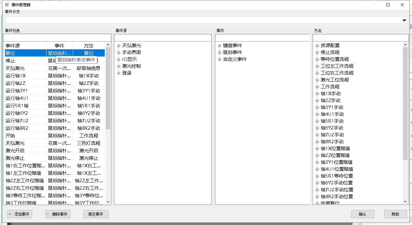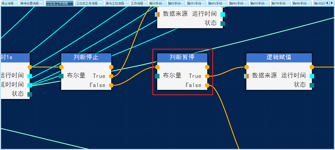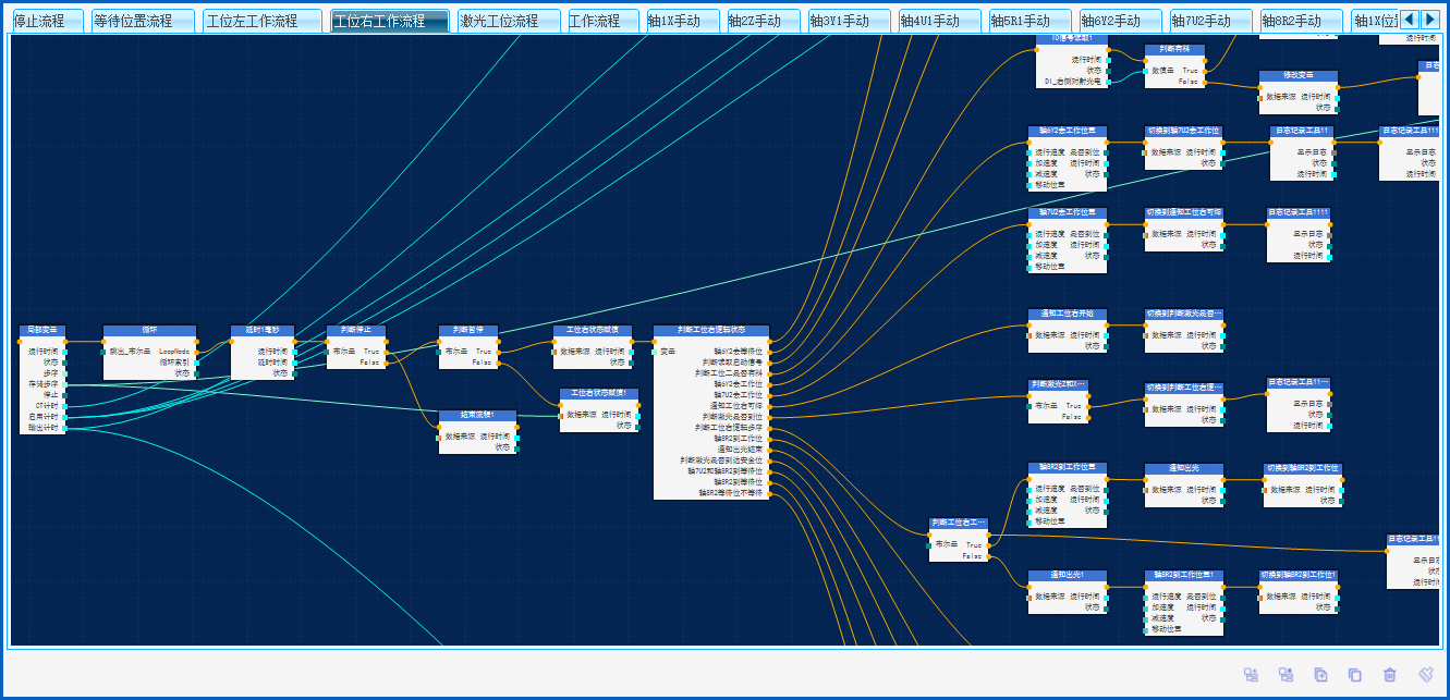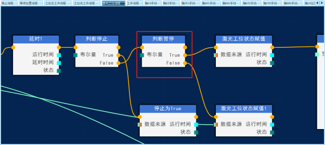 等待激光反馈到位:等待X轴到左工位出光位置是根据资源管理器中流程变量内的工位左激光到位变量实现,等待激光X和Z轴到工作位,到位激光工位流程对此变量赋值true,通过条件分支工具对此变量进行判断实现等待。