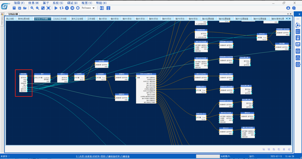 判断状态机变量:使用多分支工具判断步序变量结果控制左工位运行,运行逻辑为轴3Y1到等待位-读取工位左启动信号-读取到启动信息判断物料是否在模组上-在模组上控制Y1轴到移动到工作位-控制U1轴到工作位-通知激光流程左工位可以作料-等待X轴到左工位出光位置-R1轴到工作位,通知激光流程可出光-等待R1轴到位,通知激光流程停止出光-等待激光流程通知到等待位-控制U1轴到等待位-控制Y1、R1轴同时回到等待位-轴3Y1到等待位,通过算子库工具实现动作创立。