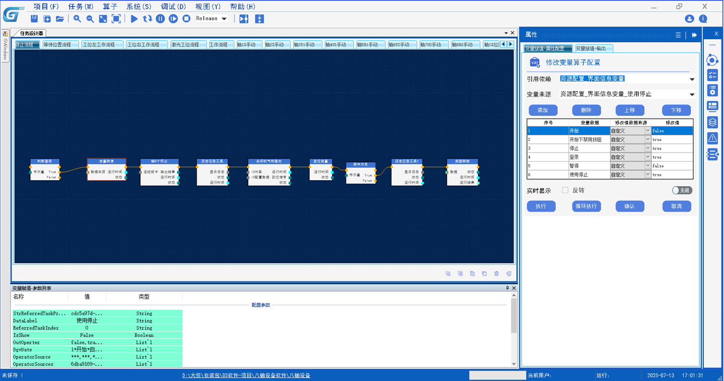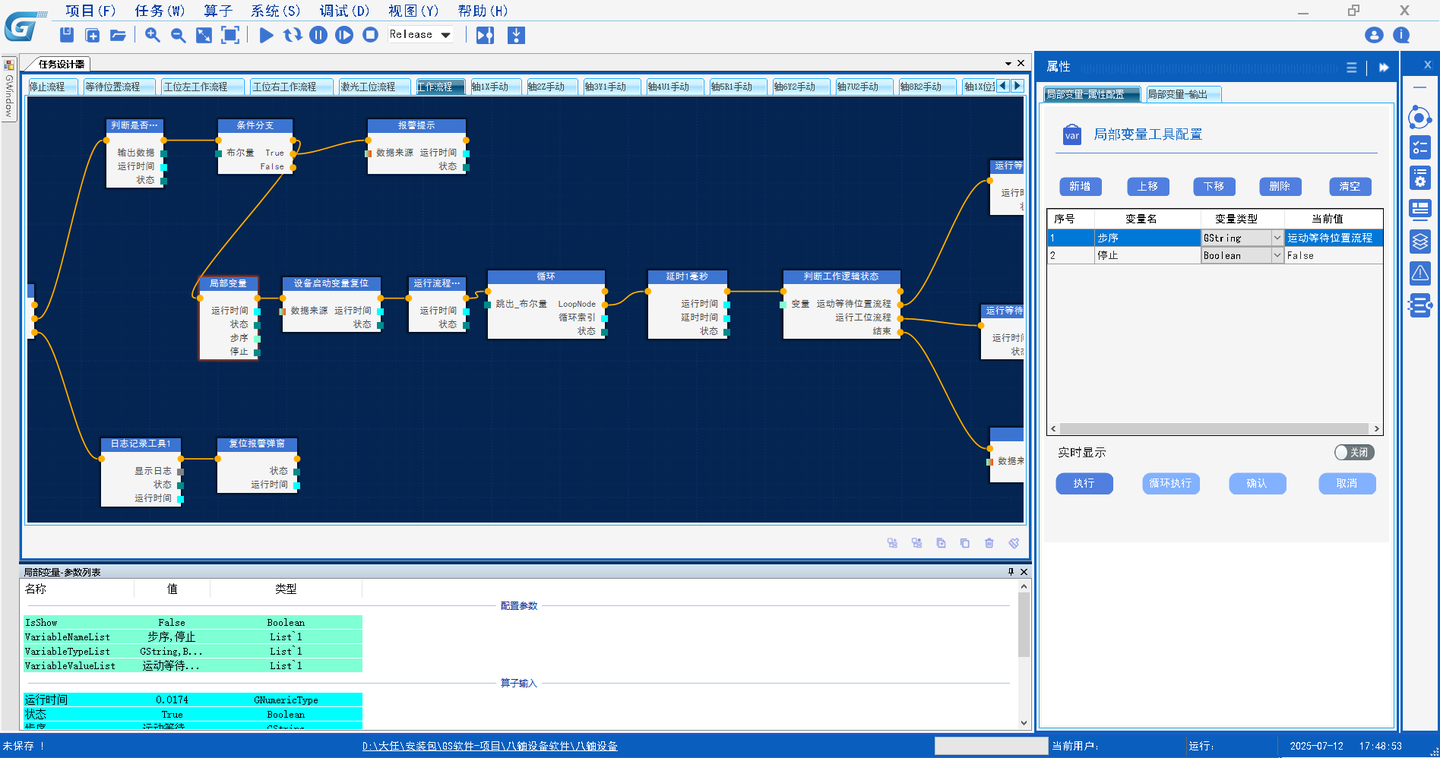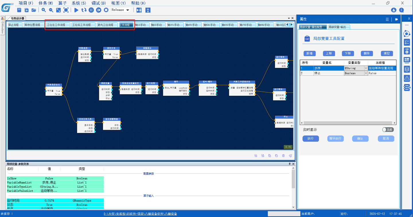 判断停止: 再使用循环工具和多分支工具实现状态机模式运行,工作流程与上面已经说明的复位流程不同的是,此流程内的循环工具停止依靠局部变量内定义的停止结果,复位流程内依赖资源管理器内流程变量的停止结果,这是因为当设备复位时只有复位流程控制设备运行,而设备在正常工作时是通过工作流程触发其他流程执行,触发完成后工作流程即可退出运行状态,所以需要使用不同的变量进行控制,避免让其他流程停止运行。