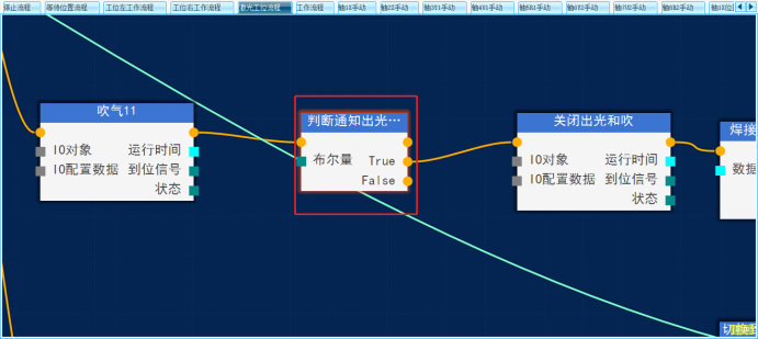 判断停止出光变量:使用条件分支算子判断资源管理器中流程变量内的通知出光结束变量实现,由工位左/右工作流程反馈,接收到为true后执行停止出光步序,通过气缸算子关闭焊接和设备吹气: