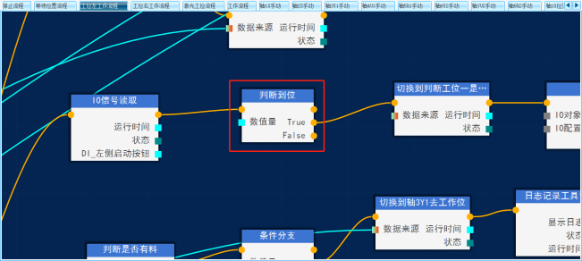 然后通过条件分支算子判断读取左侧启动信号的值是否为低电平,低电平表示启动按下被按下,此时可将左侧物料送入。