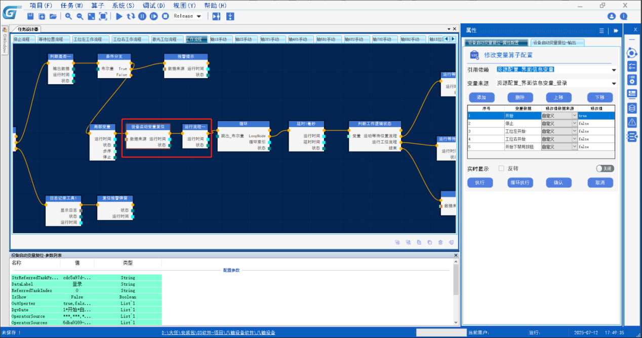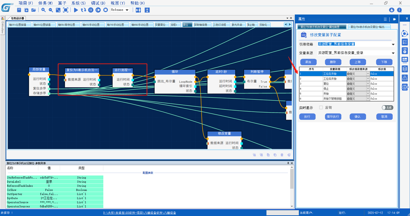 上图框选修改变量和运行流程算子实际功能同样都是将资源管理器定义的部分变量恢复成默认值,在程序编辑的时候对于很多动作执行前都需要进行复位处理,因此变量复位过程可做一个单独流程,编辑时调用即可,减少重复编辑过程,提升开发效率