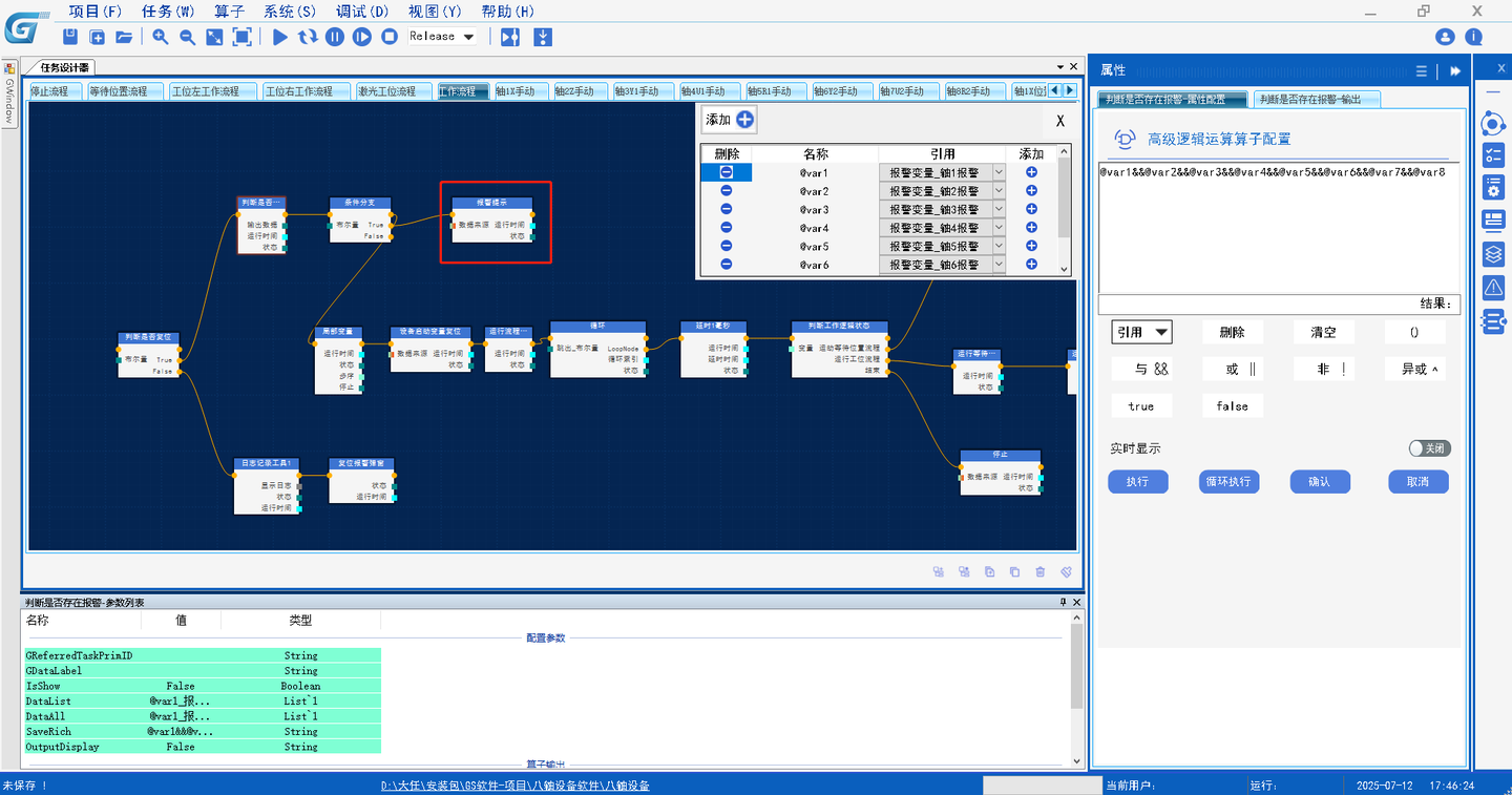 判断伺服报警:设备已正常复位,判断设备是否处于报警当中,通过高级逻辑运算器判断定义的报警变量是否有报警,存在报警进行提示