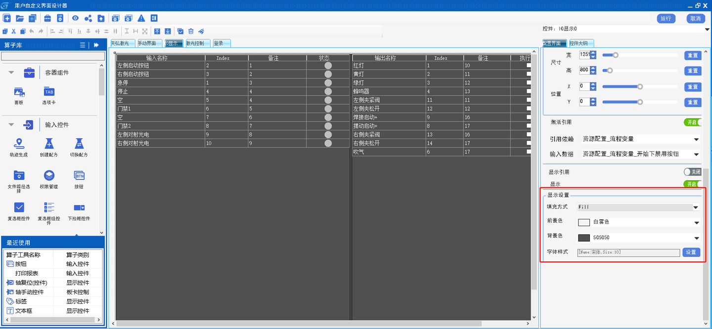 http://2.IO显示:IO界面是一个单独的窗口,在窗口上放置IO显示控件实现,打开IO显示控制配置界面,两个引用依赖分别引用初始化IO对象和IO配置数据,输入和输出都从此窗口使用,因此显示方式配置为左右,显示所有输入输出即可,HMI运行时IO显示控制自动读取IO信号并进行刷新。