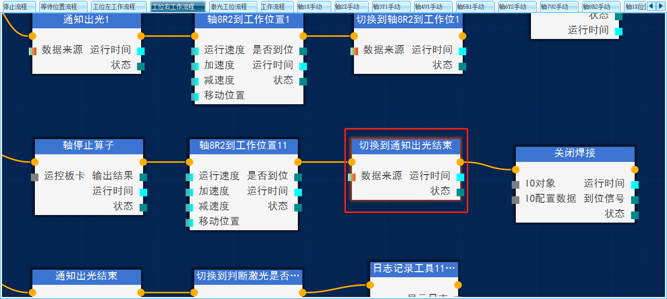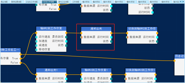 执行轴8R2到工作位结束并通知激光出光:通知激光流程可出光是根据资源管理器中流程变量内的通知出光变量实现,出光过程中R2轴需要同步运动,所以使用不等待运动,对此变量赋值为true,激光工位流程对此变量通过条件分支工具对此变量进行判断实现开始出光。