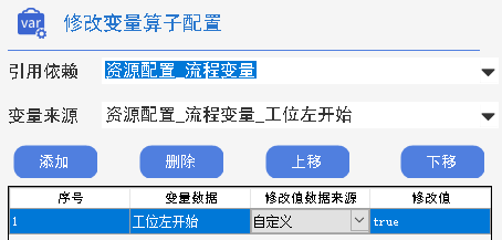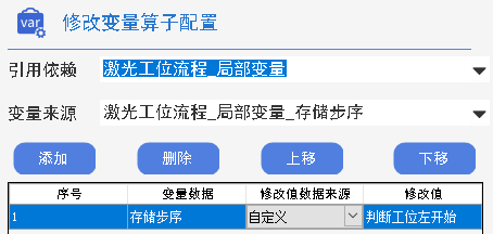 判断轴Z到安全位:等待激光流程通知到等待位是根据资源管理器中流程变量内的工位左激光到达等待位变量实现,需要等待Z轴到安全位置后才能进行下一步动作,对此变量赋值为true,通过条件分支工具对此变量进行判断是否进行下一步动作实现。