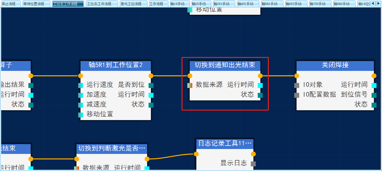 执行轴5R1到工作位并通知停止出光:等待R1轴到位,通知激光流程停止出光是根据资源管理器中流程变量内的通知出光结束变量实现,R1轴到位后,对此变量赋值为true,激光工位流程对此变量通过条件分支工具对此变量进行判断控制激光停止。