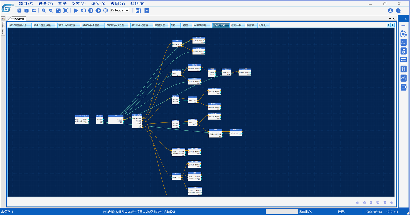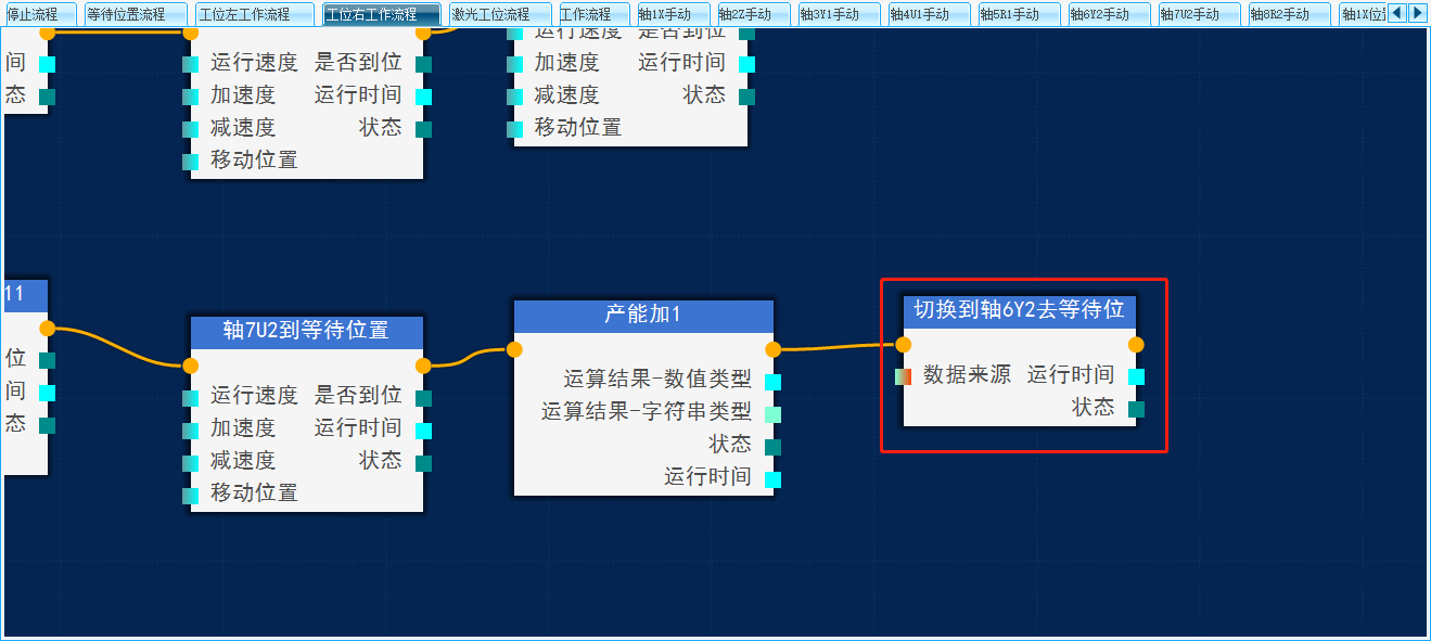 判断状态机变量:通过多分支工具判断步序变量结果控制工位右运行逻辑,工位右实现动作逻辑为轴6Y2到等待位-读取工位右启动信号-读取到启动信息判断物料是否在模组上-在模组上控制Y2轴到移动到工作位-控制U2轴到工作位-通知激光流程右工位可以作料-等待X轴到右工位出光位置-R2轴到工作位,通知激光流程可出光-等待R2轴到位,通知激光流程停止出光-等待激光流程通知到等待位-控制U2轴到等待位-控制Y2、R2轴同时回到等待位-轴6Y2到等待位,通过算子库工具实现动作创立。