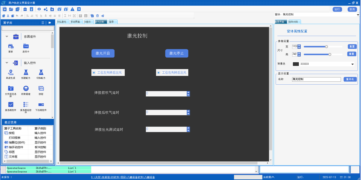 4.激光控制界面:用于手动触发激光出光以及设置手动测试出光时的参数,通过按钮触发激光开启流程执行,实现吹气-出光-停止出光-关吹气功能。