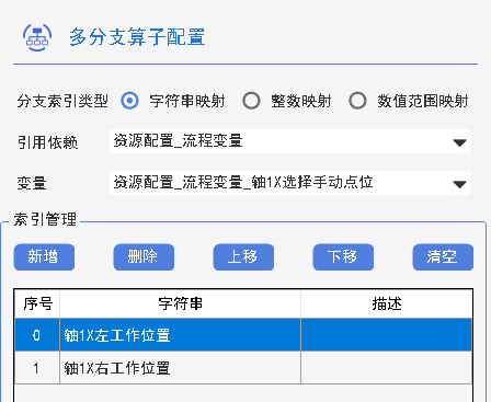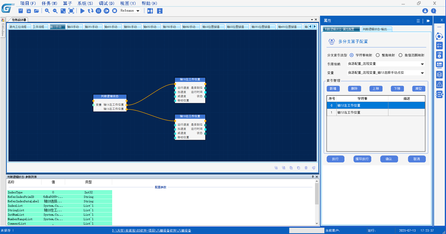 运行HMI鼠标单击此按钮时触发轴1X流程执行,通过多分支算子解析下拉列表绑定的变量,执行相应动作