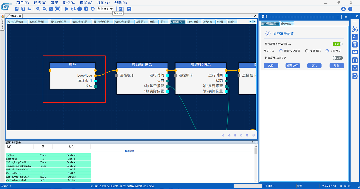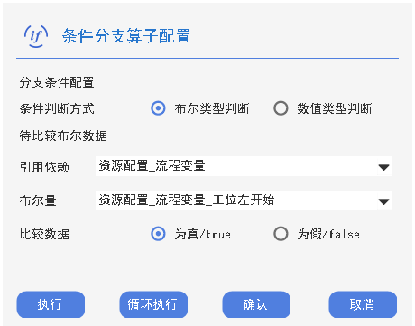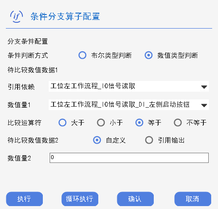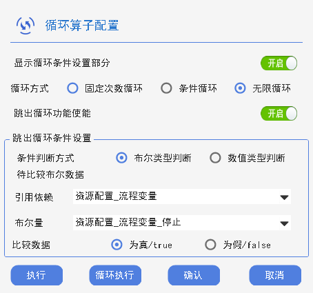 是否退出循环:通过循环算子实现长时获取,配置为无限循环,运行软件时自动触发此流程执行,当退出软件时流程执行结束