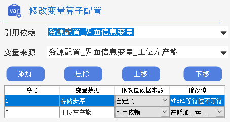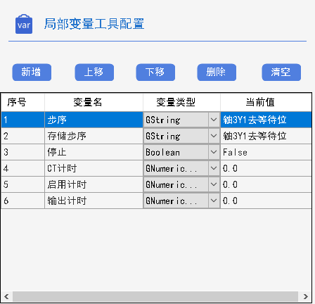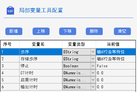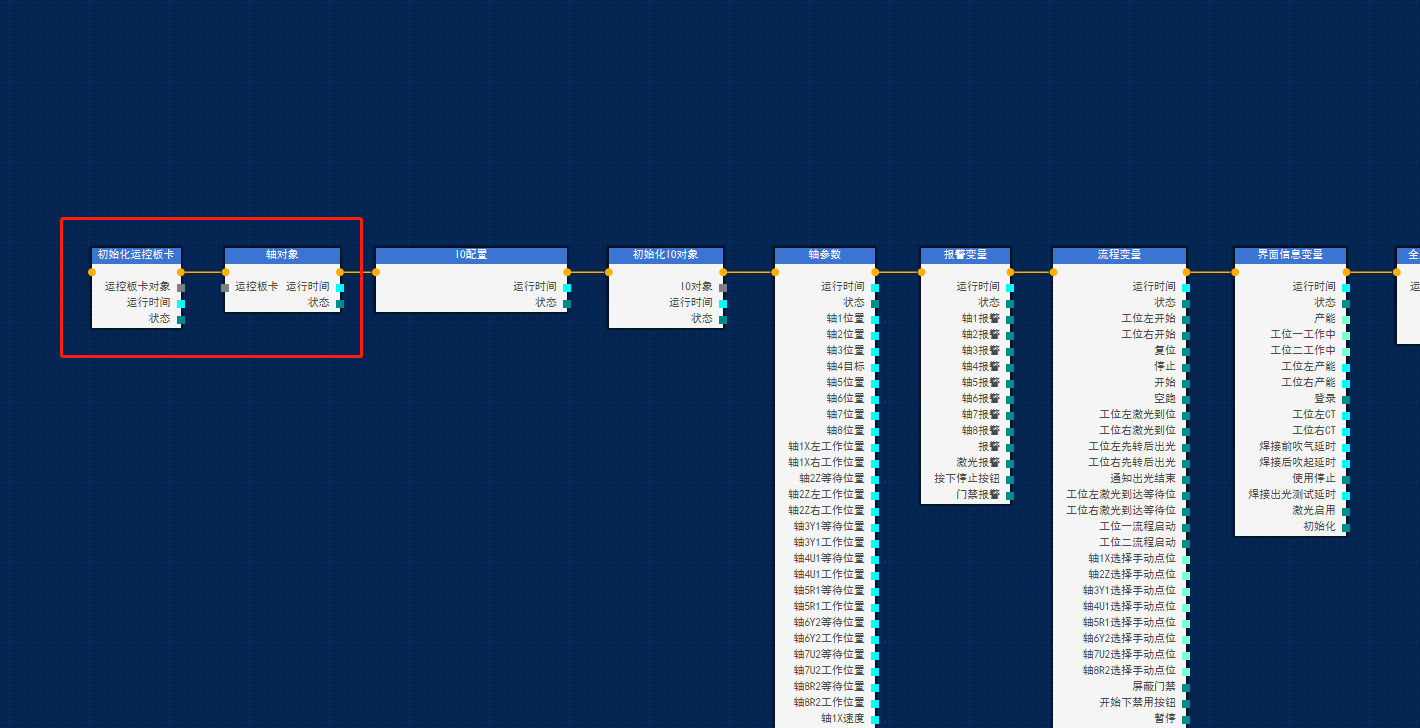 第三步:配置使用变量,将轴参数变量(包括轴速度、轴安全位置、轴等待位置等)、界面显示信息变量(包括界面产能、配置参数存储等)、控制流程交互变量(包括设备运行状态、工位流程交互、按钮操作逻辑判断等)、设备初始化变量(用于存储板卡是否连接异常以及轴是否伺服断电)等