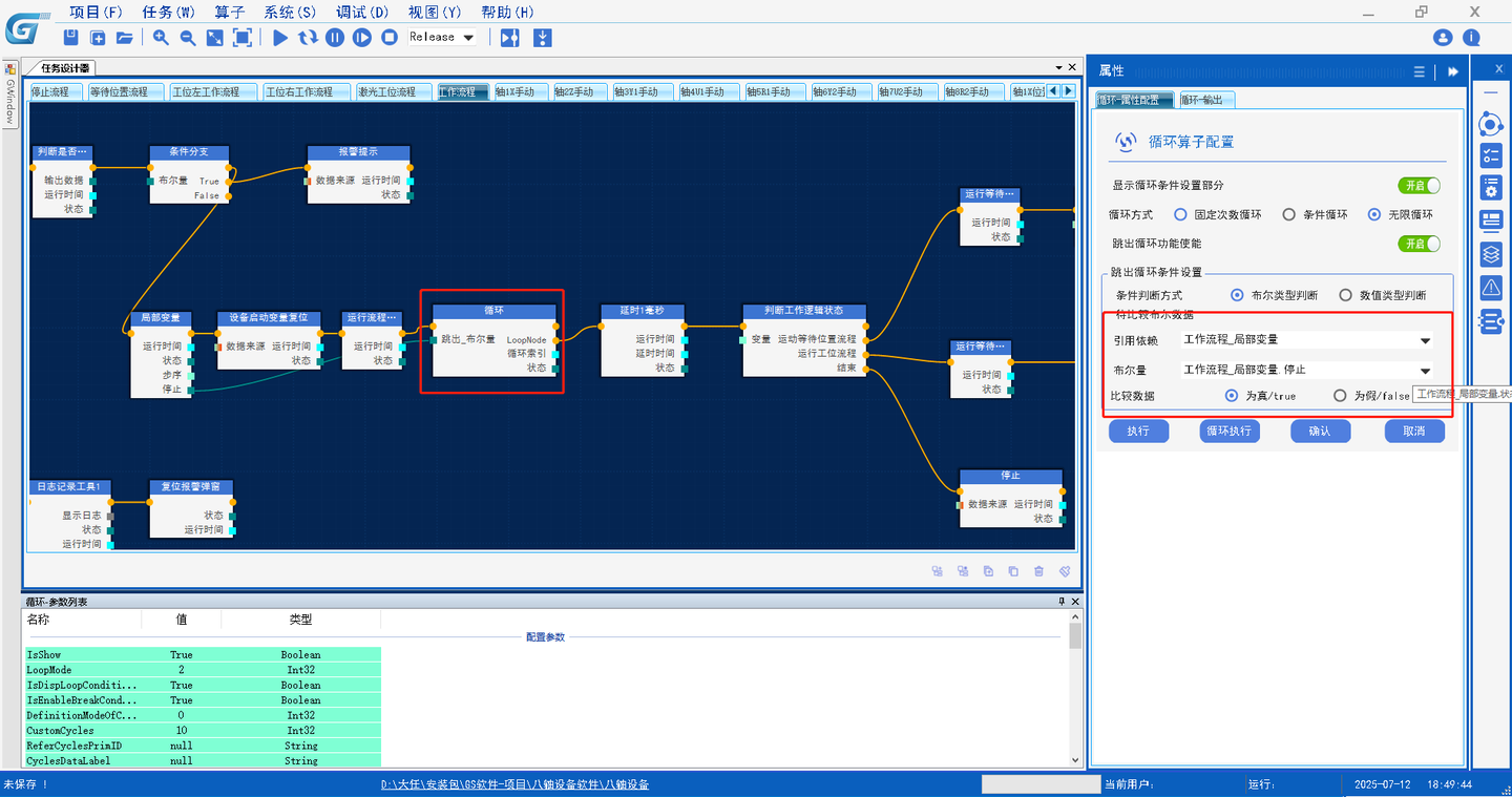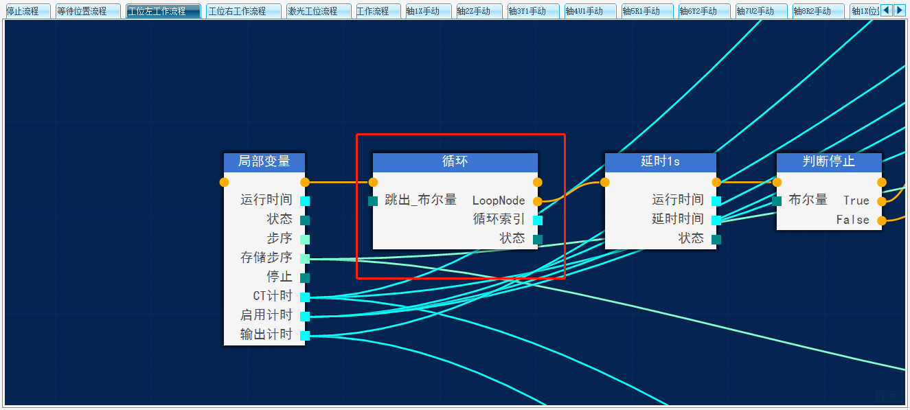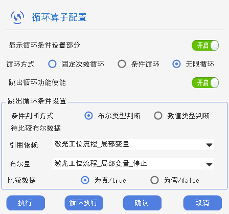 判断停止:使用循环工具和多分支工具实现状态机模式运行,和工作流程结构相同,搭建时由于结构都是一样,通过赋值粘贴流程功能赋值一个流程并修改为激光工位流程,循环算子引用局部变量的停止,配置为无限循环。