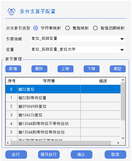 当分支动作执行结束后,通过循环算子让流程重新开始循环,设备正常工作的情况下将存储步序值赋值给复位步序,再通过多分支工具判断复位步序值执行动作;