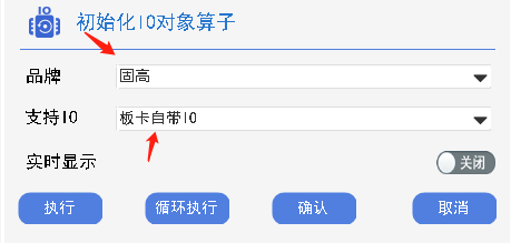 通过IO配置算子导入配置过的IO文件即完成配置IO资源,设备IO模版使用的是GTS配套的端子板,GS平台对此端子板的设定为板卡自带,所以初始化IO对象品牌选择固高,支持类型选择板卡自带,即为控制板子板输入输出: