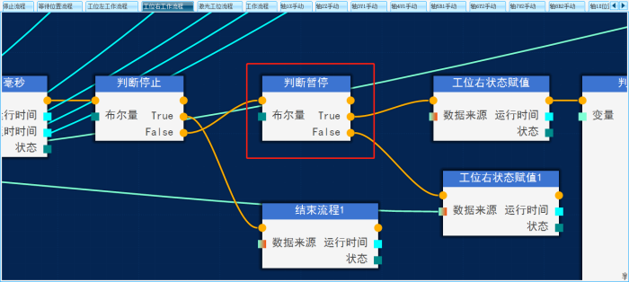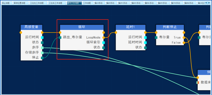 等待位置流程和工作流程一致,循环工具的停止都依靠局部变量定义的停止,当等待位置流程运行到停止步序时将此变量赋值为true,控制流程结束。