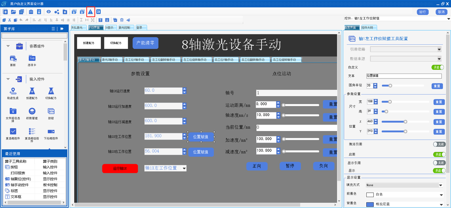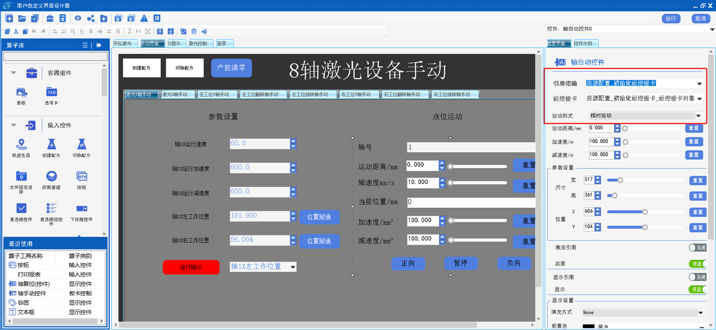 通过数值增减控件实现轴参数的传递,控件绑定资源管理器定义的轴参数变量,手动修改显示参数时同步修改到绑定变量中,实现数据交互,例如轴1X运行速度: