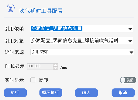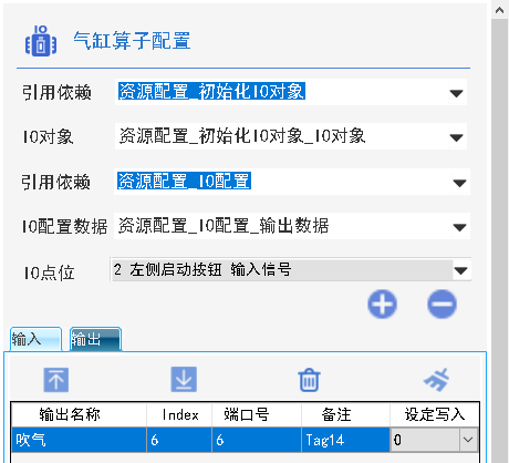 激光出光:由工位左/右工作流程反馈可出光后通过气缸算子控制设备吹气,引用初始化IO对象和IO配置输出资源,如下图所示: