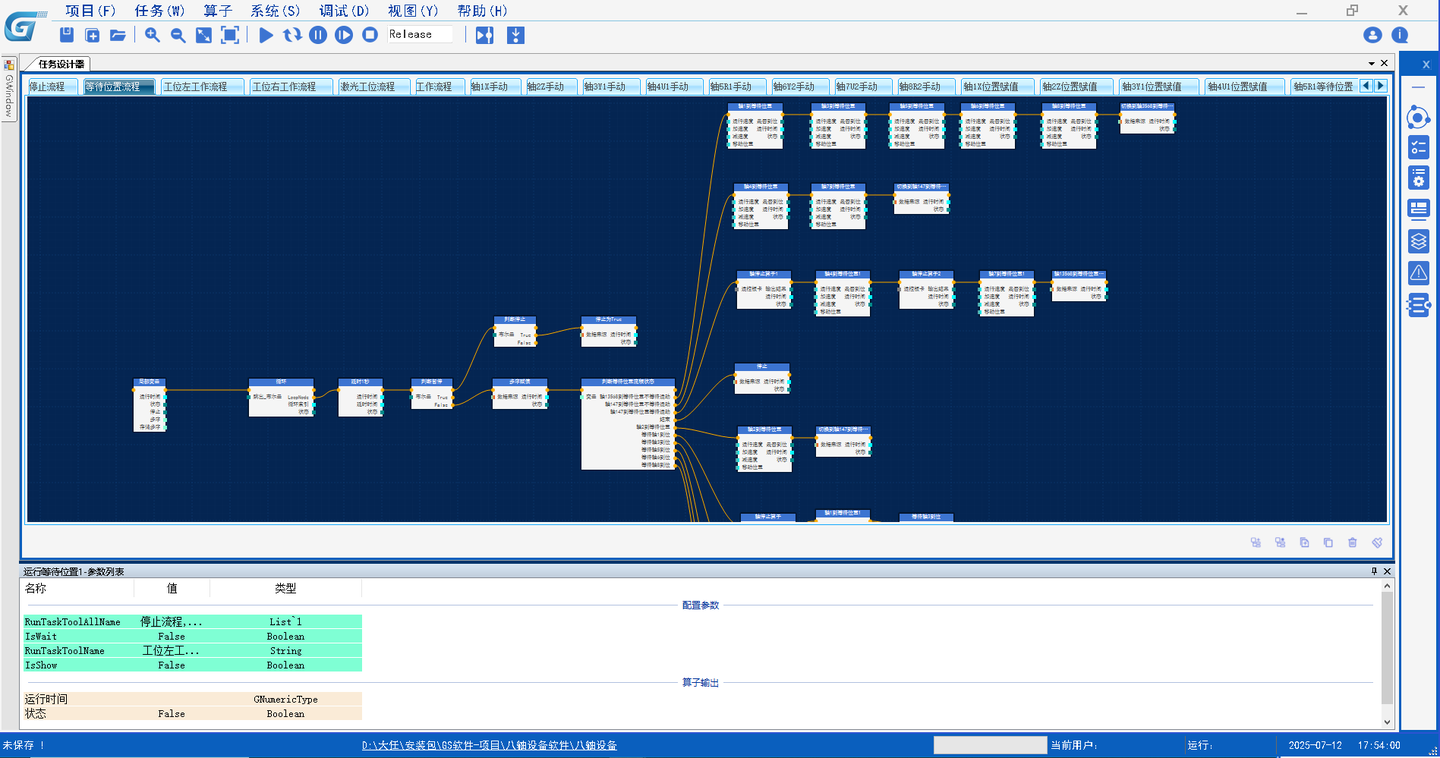 等待位置逻辑:控制Z轴到安全为止-U1、U2到等待位置(不等待运行)-U1、U2等待位置(等待到位)-X、Y1、Y2、R1、R2到等待位置(不等待运行)-X、Y1、Y2、R1、R2到等待位置(等待运行)-等待位置流程结束,通过算子库内提供模块实现此逻辑编写。