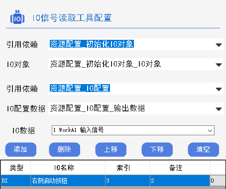 读取并判断工位右启动信号:通过IO读取算子引用资源管理器初始化IO对象和IO配置算子输出IO资源实现读取,配置读取IO如下图所示: