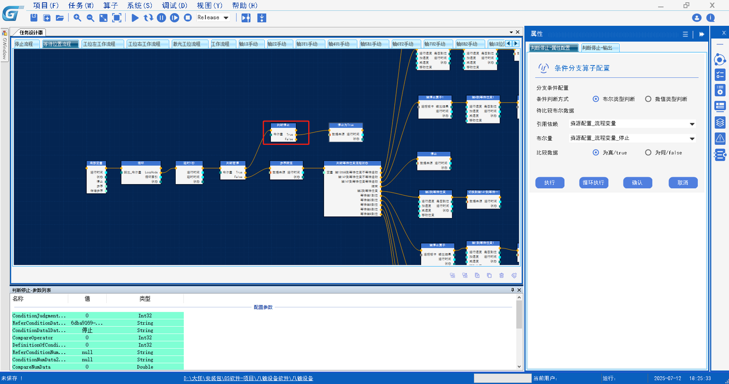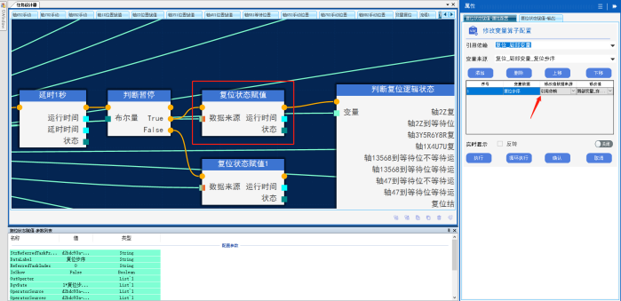 根据流程图,完成剩余分支搭建后,复位动作完成,将停止和复位变量结果赋值为true,循环算子配置的判断条件成立,复位流程结束运行,完成复位。