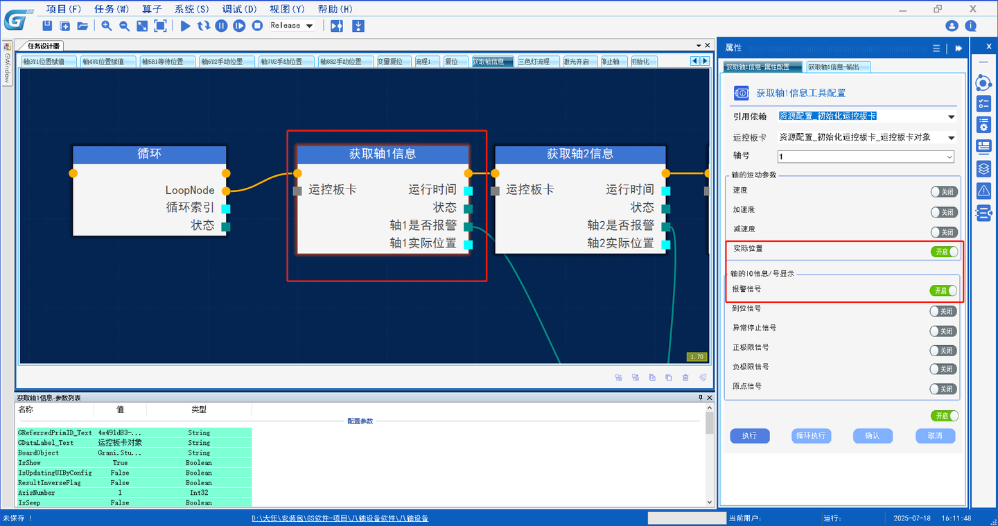 获取8个轴信息:使用获取轴信息算子得到轴报警和轴位置信息,设备包含8个轴,因此使用8个获取轴信息算子,算子配置如下图: